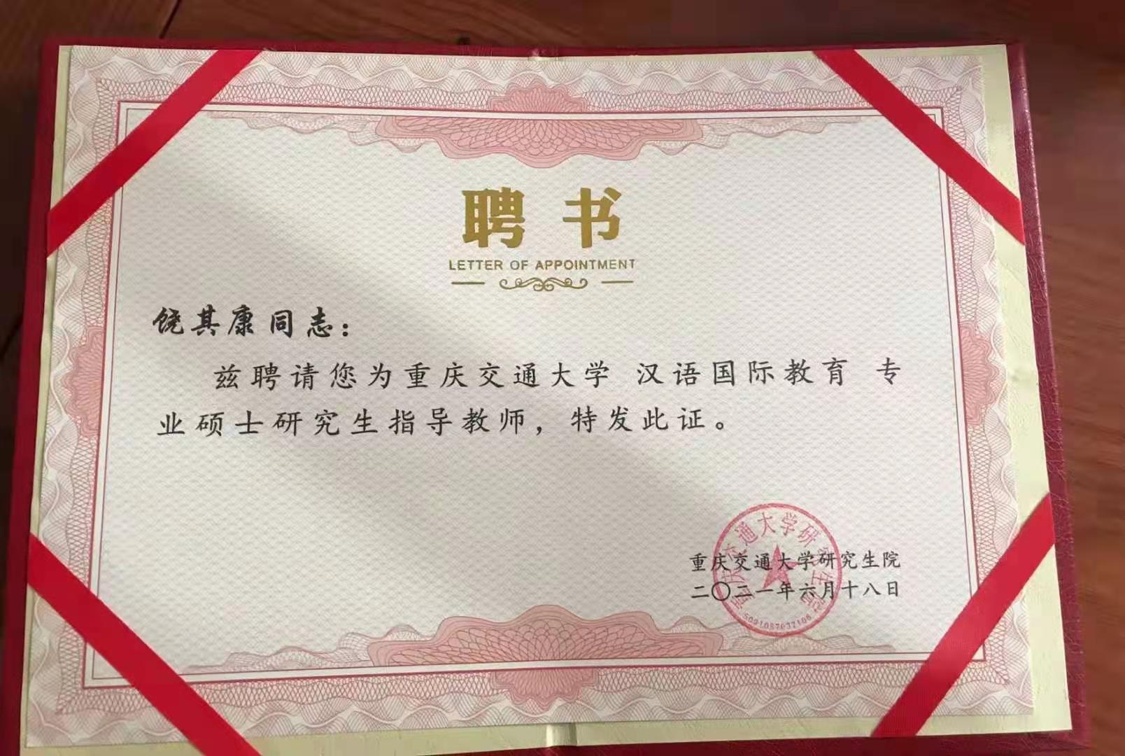 经过重庆交通大学严格的审核程序,2021年6月,我中心主任饶其康受聘为重庆交通大学汉语国际教育专业硕士研究生指导教师。