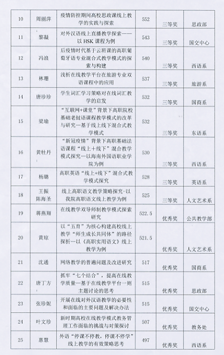 我院教学指导委员会联合科研设备处和涉外职业教育研究中心于2020年4月向全院教师征集“在线教学"专题论文,截稿时共收到全院各系部教师投稿30篇。我院的9位专家根据《学院2020年在线教学优秀论文评审标准》,对论文进行评审,评选出一等奖论文3篇,二等奖论文6篇,三等奖论文9篇和优秀奖论文7篇。其中,国际交流中心对外汉语教研室的对外汉语教师黎凝、张珍妮分别荣获“在线教学优秀论文”三等奖、优秀奖。