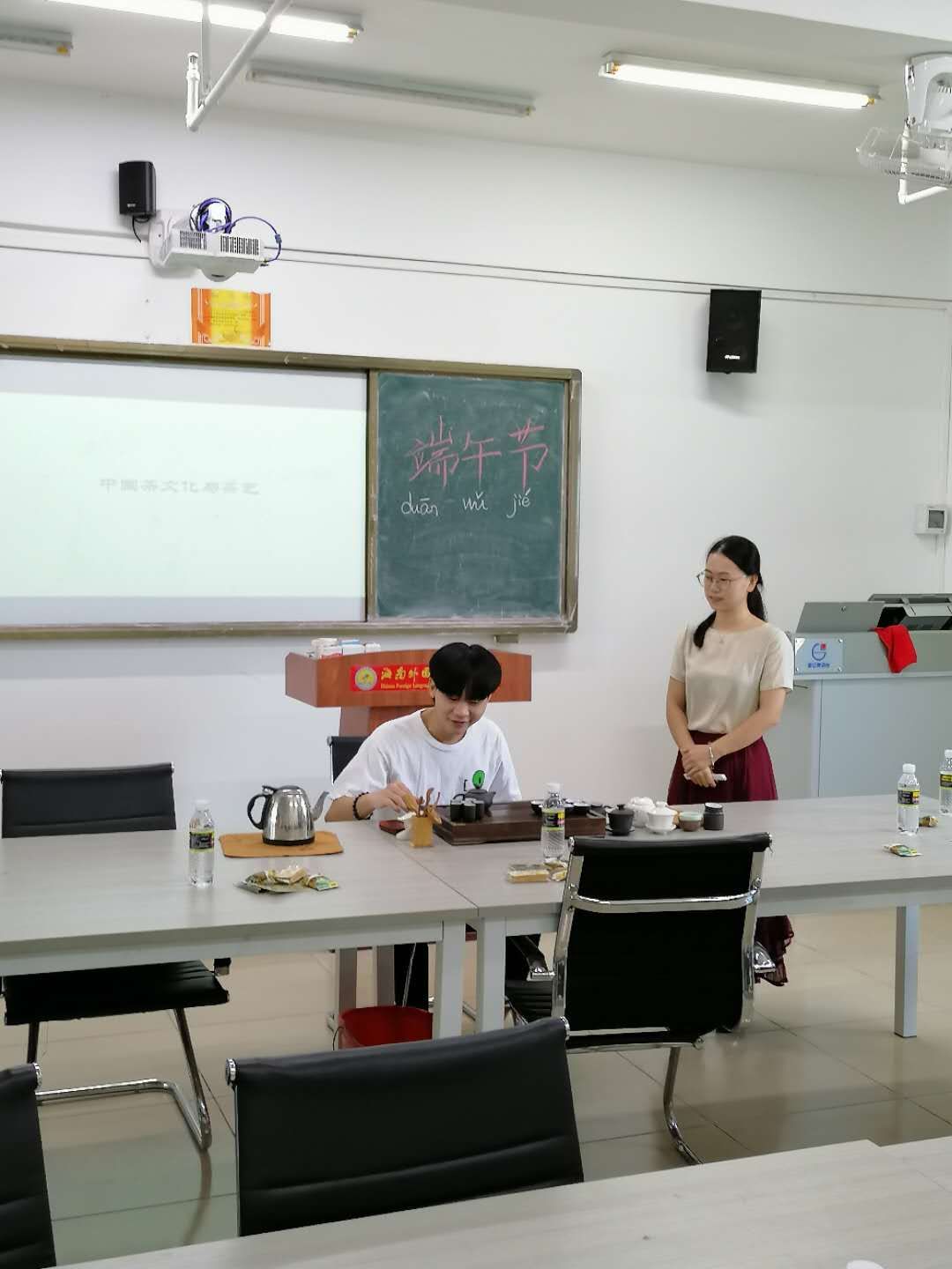 图为赵卫红老师和国际学生赏析端午节主题诗词《渔家傲》