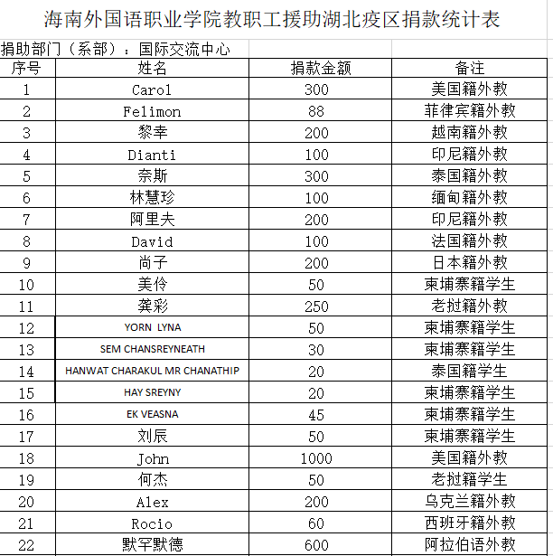 (七)中外凝心聚力。经过这段时间的努力,我院的外籍人员均能定期掌握我国的疫情防控情况,主动配合相关媒体的采访工作,传递正能量的价值观,在校外籍人员无物资短缺,外教和国际生的在线教学逐步步入正轨,外籍人员基本可以自主通过相关APP了解中国防疫动态,并积极参与beat365的捐款活动,外籍师生累计捐款4013元。