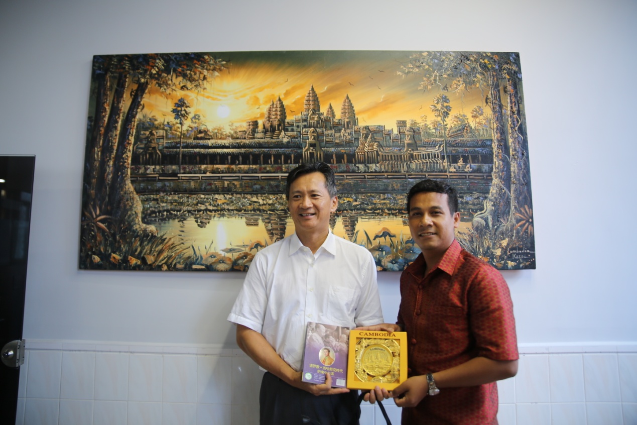 王虎老师向海南省政协常委、秘书长陈超赠送书籍《诺罗敦.西哈努克时代的柬中关系》