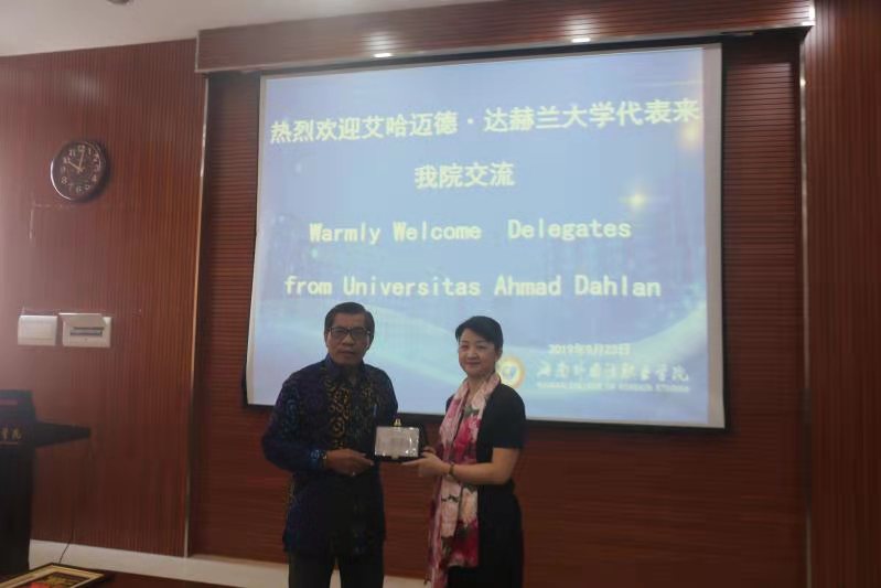 艾哈迈德·达赫兰大学KASIYARNO校长对我院的热情接待表示衷心的感谢。艾哈迈德 达赫兰大学是一所综合性大学,专业覆盖医学、农业、法律、外语、师范教育等,自2008年就开始与中国的高校建立合作,先后培养了超过500名的中国留学生。现有在校生约30000人,教职工760多人,共有6个校区。KASIYARNO校长表示希望双方加强合作,合作领域可以扩大至英语教育、国际贸易和阿拉伯语教育;既可以开展长期的交流学习,也可以开展短期的文化体验学习活动。