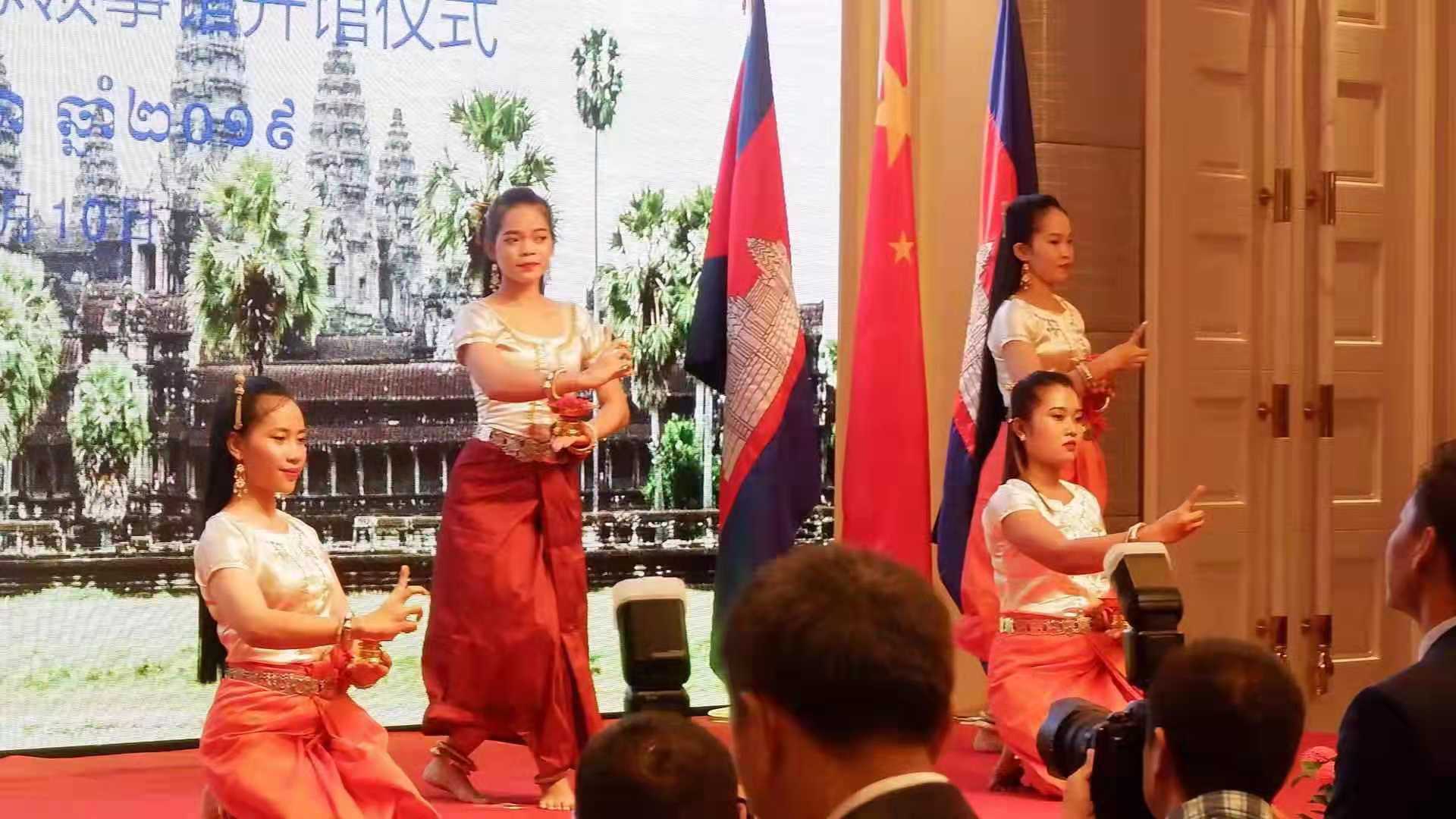 我院李渝凤院长及柬埔寨籍外教王虎老师和全体留学生应邀参加了此次开馆仪式。我院柬埔寨语外教王虎担任本次活动的翻译,我院柬埔寨留学生参与了本次活动的接待工作,并在开馆活动中表演了舞蹈“祈福舞”和“椰碗舞”及唱歌。