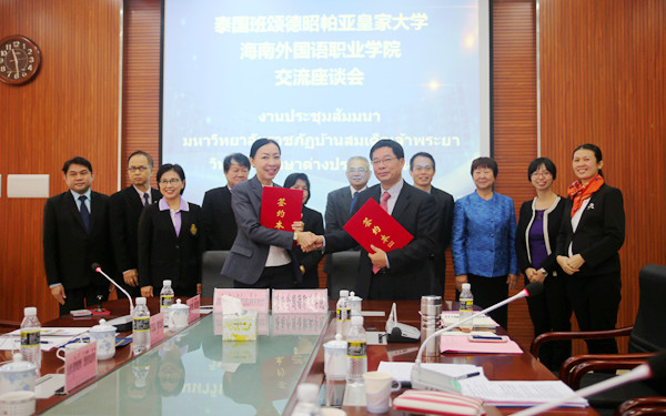 座谈会上,我院党委陈礼民书记对泰国班颂德昭帕亚皇家大学一行的到来表示欢迎和感谢,并从我院办学特色、办学优势、人才培养质量、专业建设尤其是泰语专业建设,以及对外合作交流等方面向来访一行作了介绍。他指出,我院是海南省外语语种最多、外语专业最齐的高校,外语专业是我院的办学特色,也是办学优势。随着我国“一带一路”合作倡议的推进,以及中国与东盟国家交流合作的不断深化,我院紧跟国家对外合作交流步伐,不断做好“外”字文章,多举措多渠道开展与国外尤其是东盟国家高校的合作交往,为促进海南和东盟文化交流、增进海南与东盟人民友谊做出了积极贡献。