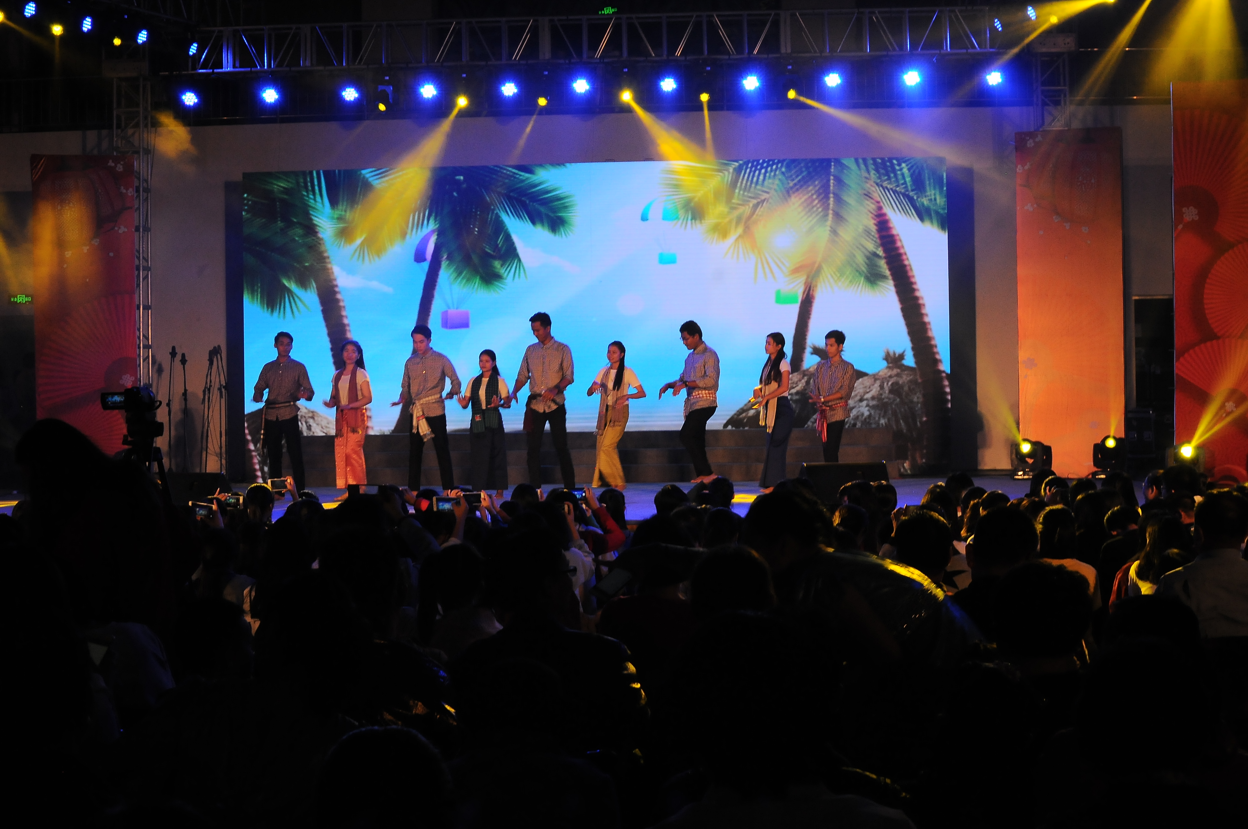 整场晚会分为《和谐篇》、《美丽篇》和《筑梦篇》三个篇章。我院学生舞蹈团的《盛世欢歌》为晚会拉开了序幕。随后,开始了三个篇章的演绎。《和谐篇》涵盖了我院留学生的串烧节目。即由来自柬埔寨、印尼两个国家的留学生通过展示3个各具特色的歌舞组成。首先,柬埔寨波雷列国立农业大学的交流生共同表演了柬埔寨的传统歌舞,即村庄为庆祝丰收而跳的多支歌舞。随后,印尼学生徐如月的一首印尼民谣《鹰》,让我们深深陶醉在了节日的欢快氛围中。最后,印尼巴厘岛的六名学生身着巴厘岛传统服饰,为我们献上了一场《士兵舞》,即为出征士兵而跳的祈福舞,铿锵有力地节奏将晚会气氛推向了高潮。
