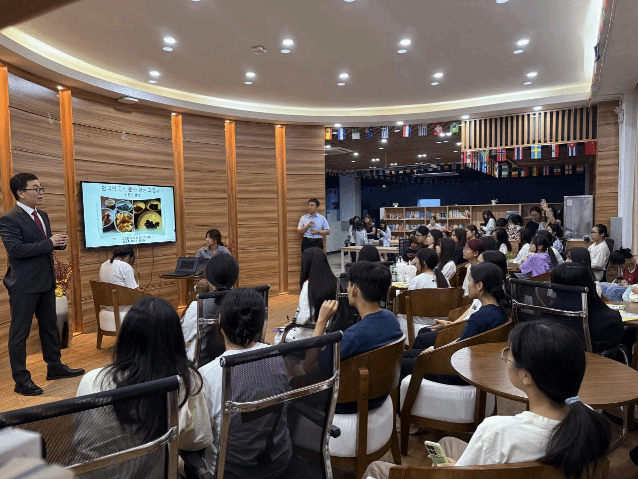 更为精彩的是,苏博士还带领同学们穿越时空,探寻了韩国饮食文化的悠久历史。他指出,尽管时代变迁,米饭作为主食的地位在韩国饮食中依然坚不可摧,这深刻反映了韩国深厚的农业传统和独特的饮食习惯。说到米饭,苏博士深情回忆了自己在河南求学时的经历,尤其是对河南米饭的独特记忆。他说,由于河南地区水质特殊,所以产出的大米味道独特,香味浓郁。他在中国也品尝到不少美食,有些美食的口味和做法跟韩国非常相近。这些相似之处,不仅仅是味蕾上的巧合,更是两国悠久饮食文化交流互鉴的见证。这种文化融合不仅丰富了韩国的饮食选择,也展示了中国饮食文化的影响力。
