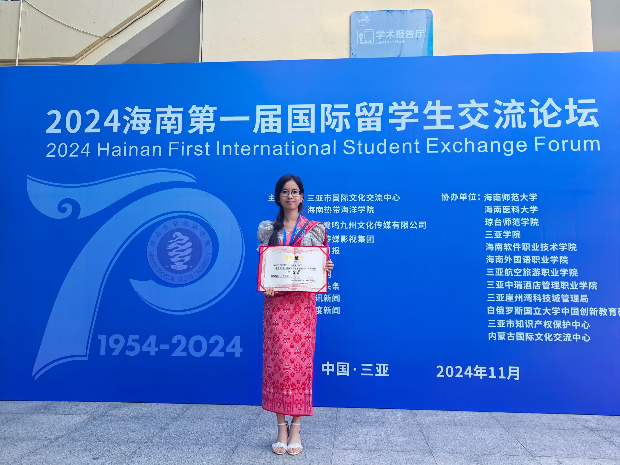 11月28日,海南第一届国际留学生交流论坛在海南热带海洋学院举行,beat365来自柬埔寨的留学生贤金凤(外文名:HEANG KIMHONG)在交流论坛中的演讲比赛环节荣获三等奖。本届论坛由三亚市国际文化交流中心主办,演讲比赛主题为“留学生眼中的海南自贸港”,全省10所高校的25名来自不同国家的留学生纷纷登台演讲,他们结合自己在海南的学习和生活经历,分享了对自贸港建设的深刻理解和感悟。