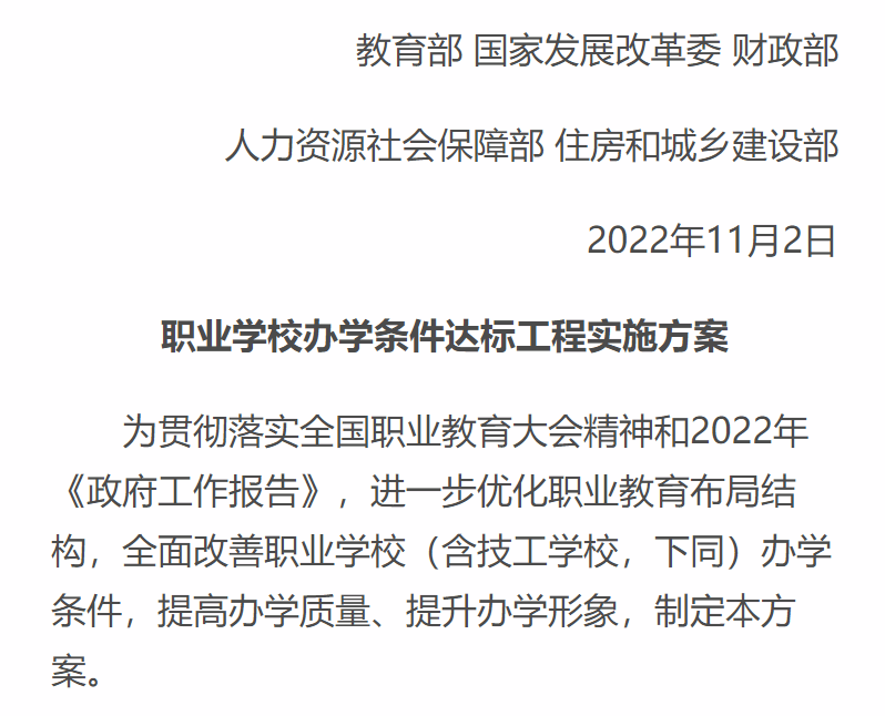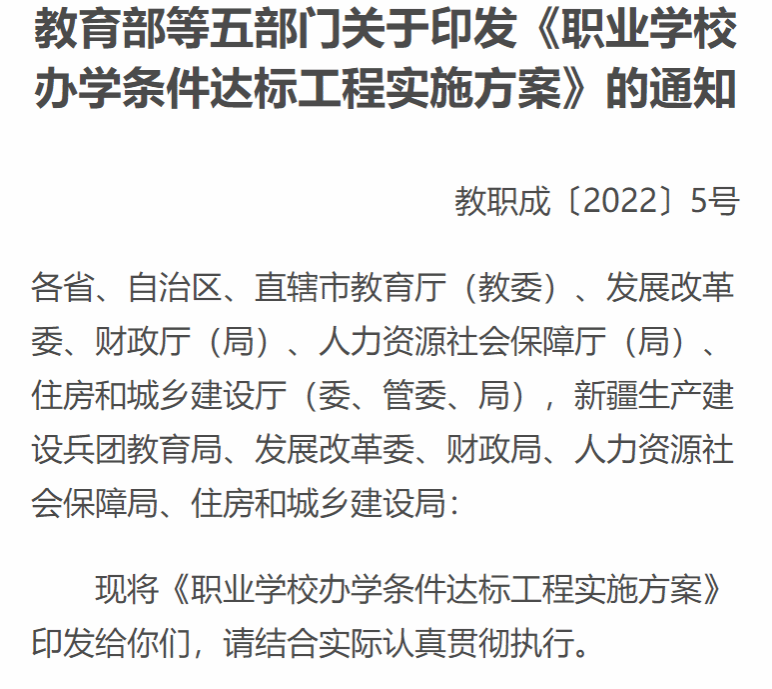 教育部等五部门关于印发《职业学校办学条件达标工程实施方案》的通知