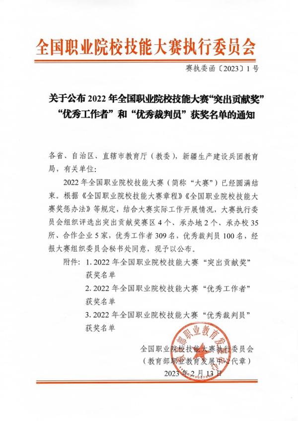 近日,全国职业院校技能大赛执行委员会发布了《关于公布2022年全国职业院校技能大赛“突出贡献奖”“优秀工作者”和“优秀裁判员”获奖名单的通知》(赛执委函〔2023〕1号),beat365作为承办校荣膺2022年全国职业院校技能大赛“突出贡献奖”。