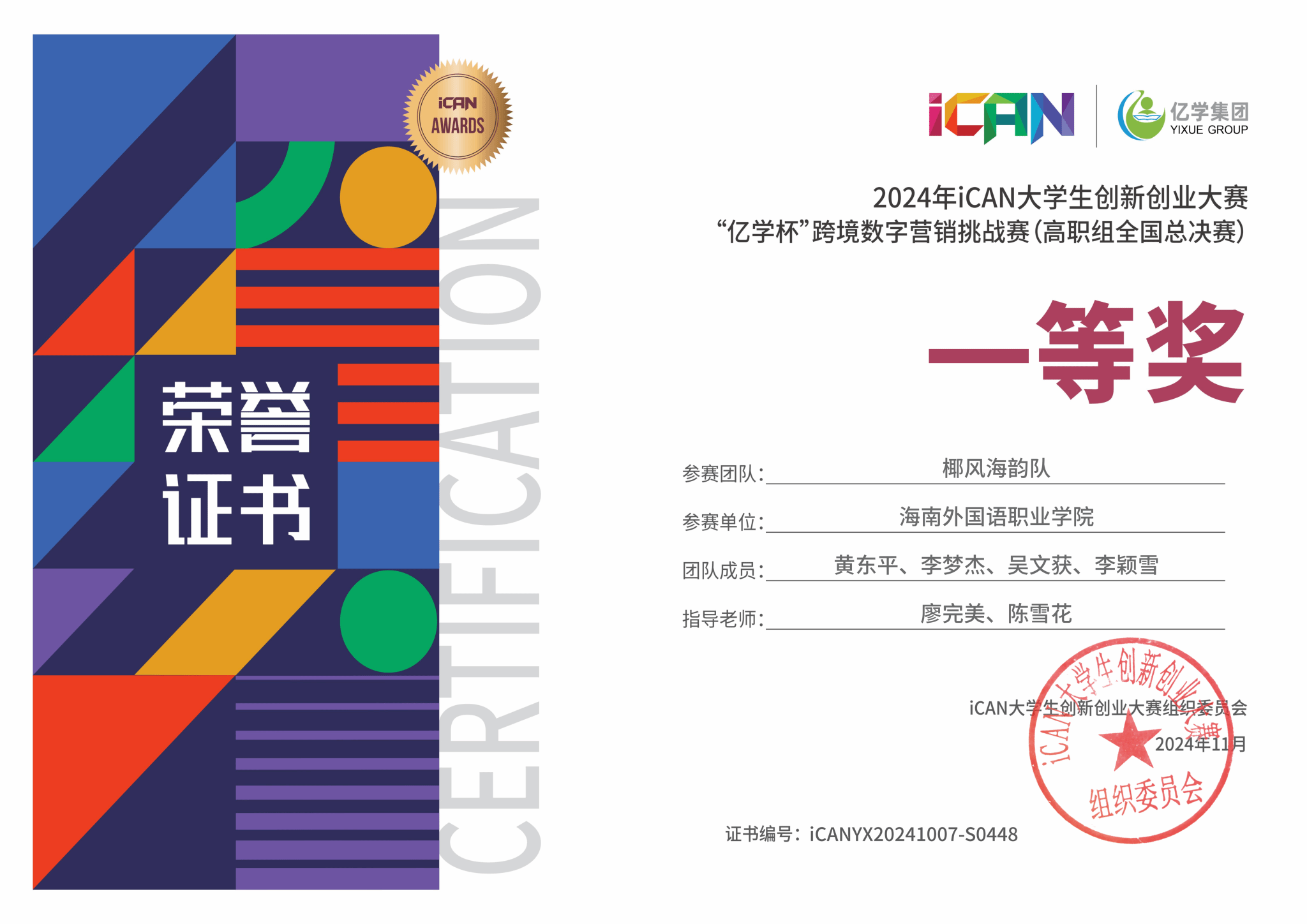 日前,2024年iCAN大学生创新创业大赛“亿学杯”跨境数字营销挑战赛圆满落幕,beat365国际商务学院黄东平、李梦杰、吴文获和李颖雪四位同学组成的代表队在比赛中表现出色,荣获全国一等奖。