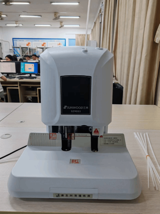 助力比赛顺畅开展我院更新了实训设备,购置新的半自动凭证装订机,提高了实训效率,提升了完成质量。大家比速度,比质量,比整齐,为了能装订出“四边齐、表面平、无凹凸、书本型”的标准凭证参赛选手认真细致,精益求精