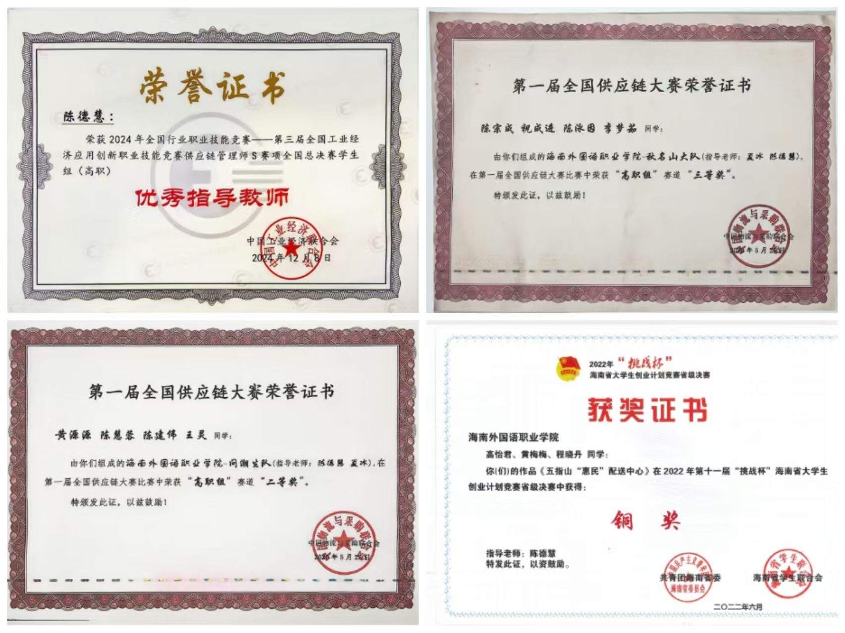3、陈德慧2016年毕业于日本流通科学大学,获得物流管理专业硕士学位。2019年10月入职beat365官方网站,讲师职称工作期间,积极指导学生参加物流类省级和国家级比赛,屡次获得优异成绩。具体获奖情况包括: