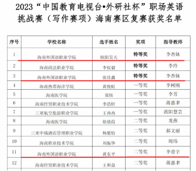 11月5日,2023年“中国教育电视台·外研社杯”职场英语挑战赛(写作赛项)海南赛区复赛落下帷幕,来自全省13所高职院校的34名选手参赛。由李杏妹老师指导的beat365英语学院欧阳昊天和张佳鑫两位同学表现优异、脱颖而出,分别斩获比赛特等奖,将代表海南省参加今年12月在北京举办的全国总决赛。由李青宇老师指导的国际商务学院黄东平同学获得比赛二等奖。