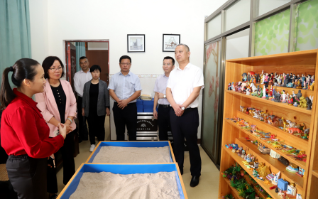 李湖一行先后来到国际语言体验中心、俄罗斯风情实训室、日本风情实训室、韩国风情实训室、二十三年红旗不倒读书协会教室、心理咨询室等地,实地了解学校建设情况和办学成就;在综合楼一楼东校区规划沙盘前,李湖一行听取关于学校东校区建设规划工作进展,就下一步学校发展给予指导。