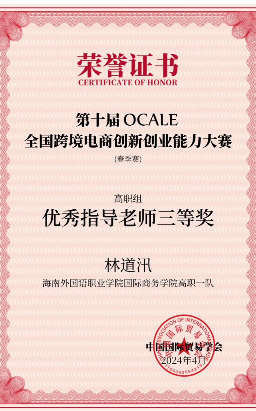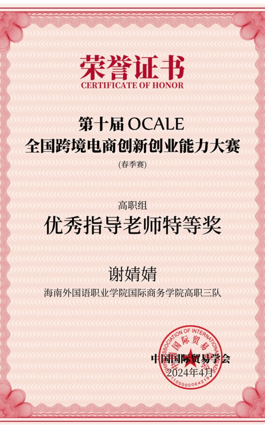 近日,由中国国际贸易学会举办的第十届OCALE全国跨境电商创新创业能力大赛(春季赛)顺利结束。经过激烈角逐,beat365国际商务学院学生王慧、苏小妹、唐达娜·吾拉勒汗、谢海云组成的团队获得全国特等奖,由学生钟梓菲、王金宜、黄文静、林丽爱组成的团队获得全国三等奖;谢婧婧老师获得优秀指导老师特等奖和三等奖,林梅老师获得优秀指导老师特等奖,林道汛老师获得优秀指导老师三等奖。