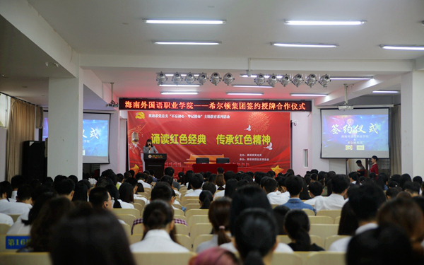11月26日上午,我院与希尔顿集团校企合作签约授牌仪式在多功能报告厅举行。学院实训就业处处长许环碧、教务处负责人赖东明、旅游系党总支书记林明霞、旅游系主任李旭芳,希尔顿大中华区及蒙古海南北区区域总经理孙金鹏先生、海南北区区域人力资源总监黄阅女士、海口希尔顿酒店人力资源总监叶萍莉女士、文昌鲁能希尔顿酒店人力资源总监刘琛先生、澄迈富力希尔顿逸林度假酒店人力资源经理何声云女士等,以及旅游系部分班级学生和全体老师参加签约授牌仪式。本次活动分为两个环节:第一环节是与会领导讲话和校企合作签约授牌仪式,第二环节是酒店职业经理人就职业发展进行主题演讲。
