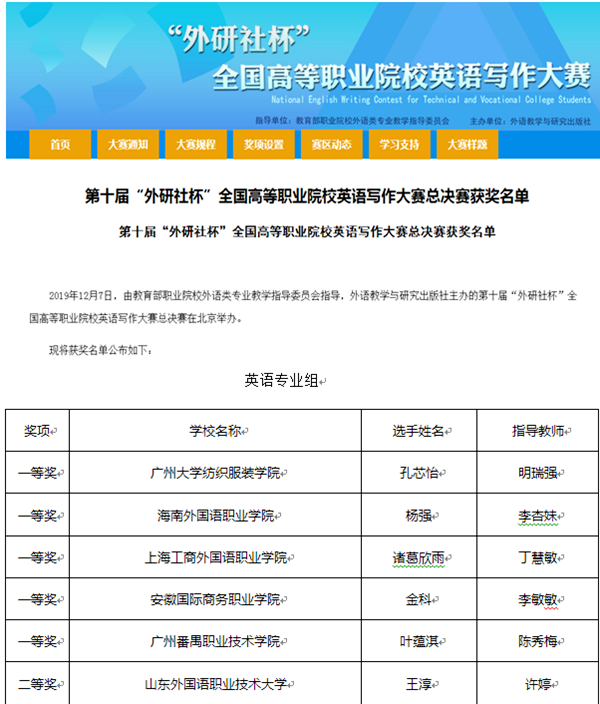 一直以来,学院高度重视对学生英语写作能力的培养和外语教学的改革手段。在“外研社杯”全国高等职业院校英语写作比赛中,参赛成绩不断取得突破,这充分展示了我院外语办学实力和人才培养质量,也充分展示了我省高职英语教育教学改革的成果。