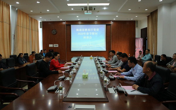 1月17日上午,省教育厅党委2020年春节慰问工作座谈会在我院综合楼7楼第一会议室举行。海南省教育厅党委委员、考试局局长杜明娥,省考试局办公室主任唐电润,省考试局办公室主任科员员丁琦,学院党委书记曾锋及学院相关部门负责人、老党员、学院困难党员、困难教职工出席座谈会。