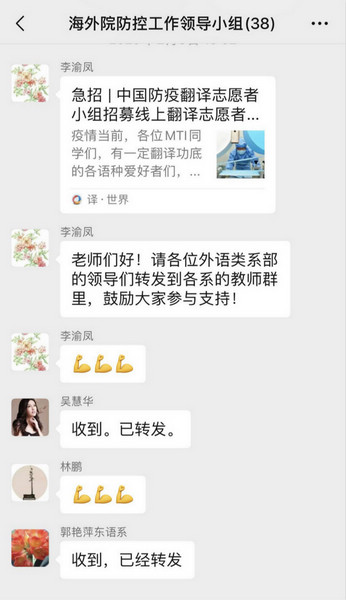 2月3日,李渝凤院长在学院防控工作领导小组微信群中发布了一则中国防疫翻译志愿者小组招募线上翻译志愿者的消息,并鼓励我院各个语种专业教师参加支持。随即,英语系、国际商务系、东语系、西语系、旅游系等系部负责人纷纷在本部门微信群中广而告之,鼓励老师们积极参加。