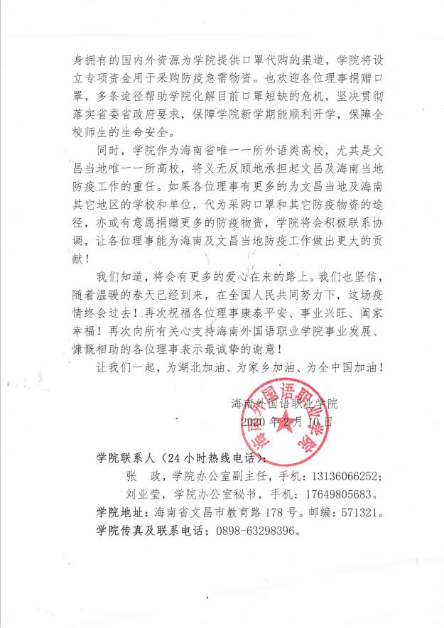 2月10日,当我院发出《致学院理事会的一封信》后,学院理事会副会长、澳门海南同乡会总会长、澳门琼澳经济文化促进会会长韩电先生,从信中得知我院新学期开学在即,除去校外实习学生外还有近5000名师生即将返校,需要大量防疫物资尤其是口罩短缺的情况后,立即向李渝凤院长表示愿意向我院捐赠5万个口罩,并立即着手通过国内外多种途径筹措捐赠口罩。因所有向海南捐赠的物资必须经过海南省红十字会统一调度,他委托我院理事会常务理事、 澳门海南同乡总会常务副会长、澳门琼澳经济文化促进会副会长王安松先生,与海南省红十字会及我院对接捐赠事宜。