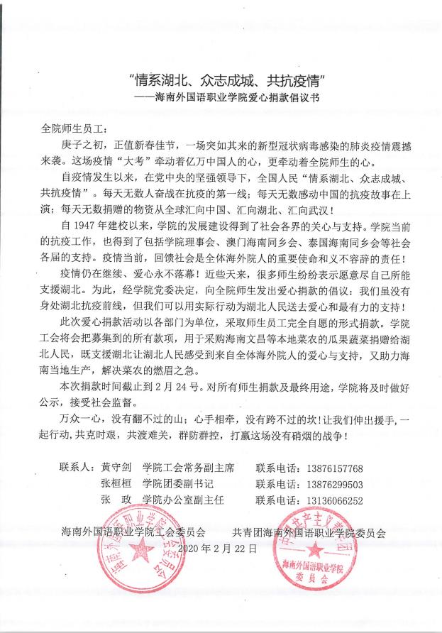 大爱无疆!疫情无情人有情,艰难时刻更显人性本色!学院理事会及社会各界对学院防疫工作的关心支持、学院全体师生两天来响应学院支援湖北倡议踊跃捐款均表明:疫情终有过去的一天,但爱心永不落幕,这是战胜疫情最强大的力量!
