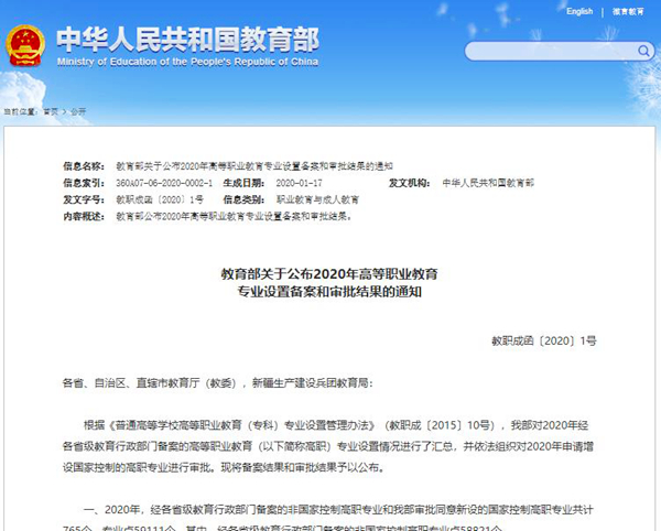 日前,教育部公布了2020年高等职业教育专业设置备案和审批结果,我院申报的国控专业“学前教育”获教育部正式批准,将于2020年起面向全国正式招生,专业设在我院英语系。
