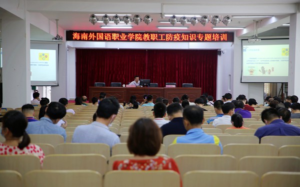 为不断加强教职工防疫知识技能普及宣传,全力保障2020年春季学期开学工作平稳有序进行,430日下午,我院在图书馆多功能报告厅开展教职工防疫知识专题培训,邀请文昌市疾控中心副主任技师、防控专家邝正文来校讲授疫情防控知识。在家的学院院长李渝凤、副院长杨学前、党委委员梁松,与各部门、各系部主要负责人,有关职能部门工作人员,全体学工人员等一同参加培训。杨学前副院长主持培训会。