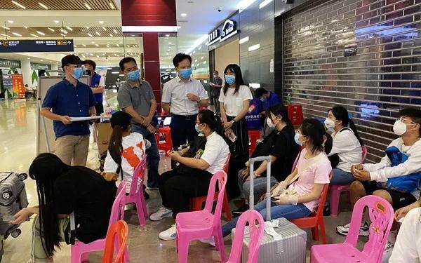 在海口美兰机场接待点,省教育厅副巡视员范敏、省教育厅高教处副处长苏永光与我院工作人员亲切交流,询问学生抵达和接待情况,嘱咐大家要继续认真做好接下来的返校学生接待服务工作。
