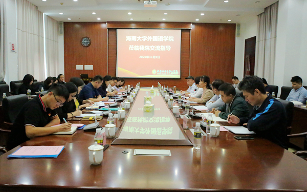 海南大学外国语学院院长金山教授介绍了海大外国语学院的历史、专业、师资、党建工作等情况,表示希望今后双方能够增进交流、各取所需、共谋发展。海大外国语学院学院党委副书记(主持党委工作)刘丽芙希望双方能够强强联手,相互借鉴、相互交流,携手共同打造我省外语人才培养的“金字招牌”。海大外国语学院党委副书记李洋介绍了学生工作的人员职责分工情况,以及常规做法和所取得一些成效。