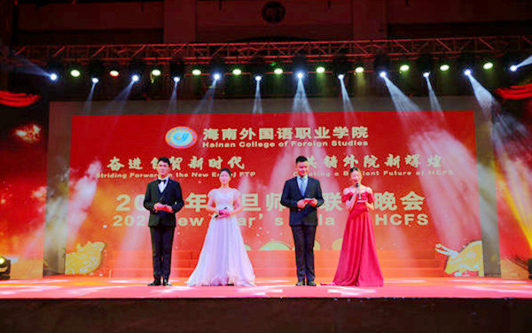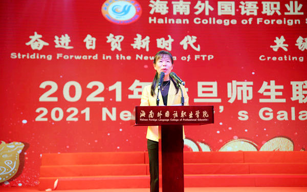 党委副书记黄丽芹代表学院致新年贺辞。黄丽芹副书记回顾了2020年来我院获得的辉煌成就,肯定了全体师生取得的成绩与进步,也给大家送上美好的祝福。她指出,2020年是不平凡的一年,因为疫情的影响,我们不忘初心,努力前进,这一年里我院积极投身海南自贸港建设这股前进的洪流,在海南自贸新时代里勇往直前,共同铸造我院的新辉煌。最后她呼吁大家不忘初心、继续前进,展望美好未来,祝福2021年学院更辉煌、海南建设更上一层楼、中国更加强盛,并祝愿晚会取得圆满成功。