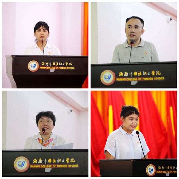 优秀共产党员代表、思想政治理论课教学科研部直属党支部党员周丽萍同志,优秀党务工作者代表、国际商务系党总支部组织委员陈仕榜同志,先进党总支部代表、旅游系党总支部书记林明霞同志,新党员代表、机关党总支部学院办公室党支部党员刘业莹同志,分别在大会上发言,表达对建党百周年华诞的祝福,对党的培养的感恩之情,以及牢记初心使命,立足两个大局,心怀“国之大者”,锐意进取,奋力前行,为学院发展和海南自由贸易港建设贡献更大力量的信心和决心。