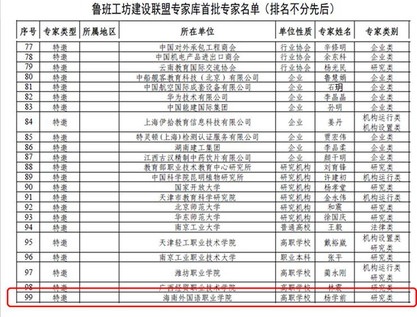 为推动鲁班工坊高质量建设和可持续发展,共同打造中国职业教育走向国际的知名品牌,鲁班工坊建设联盟组建首批专家库,为鲁班工坊项目认定和后续工作提供专业支持。我院杨学前院长成功入选鲁班工坊建设联盟首批专家库,充分体现了学院国际化办学的社会影响力得到进一步提升,将为学院今后进一步加强开放式办学,构建更全方位、更宽领域、更高层次、更高质量的教育对外开放格局创造有利条件,对促进面向国家“一带一路”建设和海南自由贸易港建设开展国际化高素质应用型外语人才培养,打造更具特色、更高水平的“外”字创新品牌具有十分重要的意义。