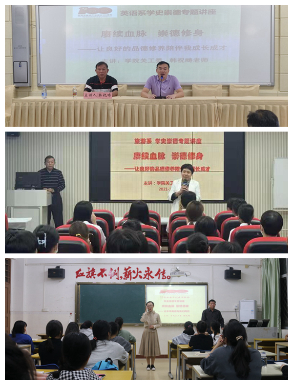 三场讲座均以升华道德认知、强化道德自律、砥砺道德实践为基线,以立德固本、精神历练、赓续红色血脉、传承红色基因为主旨,以坚定信仰跟党走,做党的人、成国之才为目标,引用中国历代传统文化崇德修身的典故古训、名人名言,选用当今社会日常生活中的事例、照片、微视频为例,从理性到感性,从宏观到微观,深入浅出教育引导同学们赓续血脉、崇德修身。