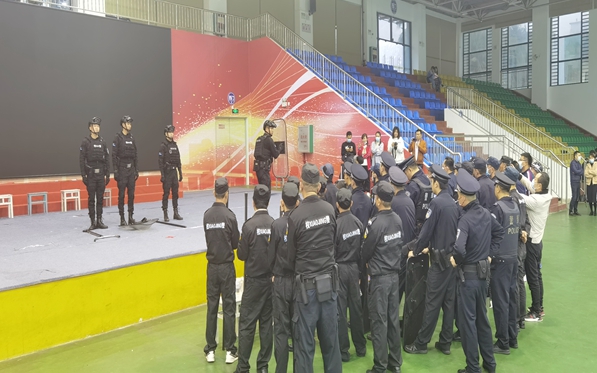随后在学院体艺馆开展的反恐实地演练中,模拟了两名“暴徒”混入校园袭击在校学生,校园安保人员发挥扎实的处置能力,第一时间报警求助并有序地组织现场人员安全撤离,随后与迅速到场的民警们合力将“暴徒”制服,成功解除危机的场景。此次演练安全有序,达到了预期效果,强化了对师生的反恐宣传教育。演练最后,反恐大队民警还为学院安保人员进行了反恐防暴器具使用培训。