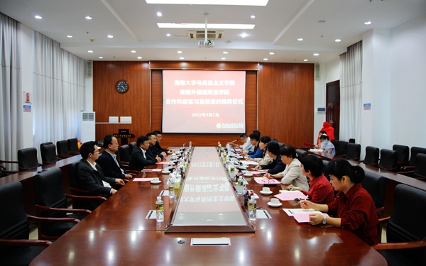 2022年3月1日下午,海南大学马克思主义学院张云阁院长一行到beat365官方网站签约合作共建实习基地,学院党委书记佴建乔,党委副书记、院长杨学前,党委副书记黄丽芹热情接待了张云阁院长一行。