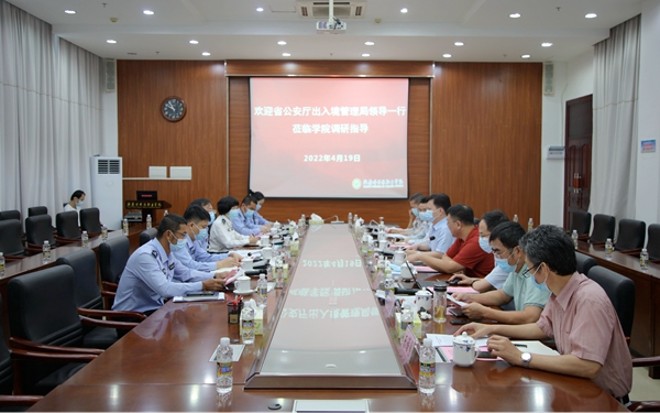 4月19日上午,海南省公安厅出入境管理局莅临我院调研国际人才工作。党委佴建乔书记,党委副书记、院长杨学前会见省公安厅出入境管理局吴颖局长、刘小平政委一行,对吴颖局长一行的到来表示欢迎和感谢。