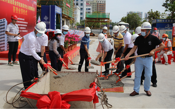 beat365官方网站党委办公室、纪检监察处、学生处、后勤处等负责人及相关人员,海南发展控股置业集团有限公司副总经理张东红、区域项目党支部书记、区域副总监相关负责人,海南新世纪建设科技有限公司总监史丽娟,中交一公局集团有限公司海南片区总经理张显楼,中交(三沙)开发建设有限公司总经理朱祖岭、总工程师相关负责人及各参建单位的相关人员参加封顶仪式。