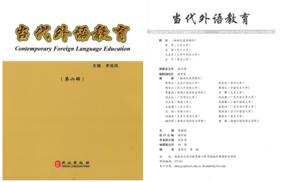 《当代外语教育》稿件来源采取约稿与作者自由来稿两种方式。截至目前,已由外文出版社出版发行6辑,共刊发外语教育研究、外语教学研究、语言研究、翻译研究、文学研究、东南亚语言文化研究等领域的学术论文百余篇。其中,“名家特稿”和“专家笔谈”两个栏目收录了教育部“长江学者”特聘教授、博士生导师黄国文教授、清华大学博士生导师封宗信教授、西南大学博士生导师文旭教授、湖南大学博士生导师刘正光教授、湖南师范大学博士生导师廖光蓉教授以及美国加州州立大学奇科分校张爱平教授等国内外知名专家学者的专稿,产生了一定的学术影响力,为广大外语教育工作者提供了交流对话的平台,成为一方具有特色的外语教育研究园地。