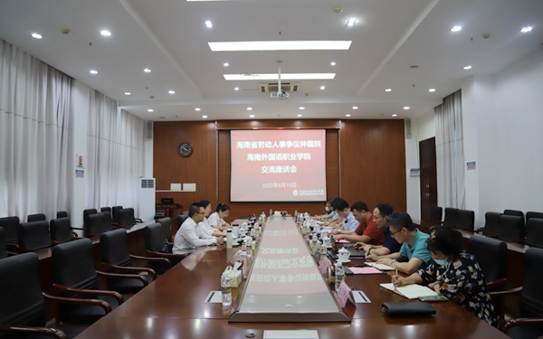 在《中华人民共和国海南自由贸易港法》颁布实施一周年之际,6月10日下午,海南省劳动人事争议仲裁院左菲院长一行来校调研,商讨涉外劳动仲裁员培训、建立实习实训基地、多语种涉外服务模式等相关事宜。党委副书记、院长杨学前出席会议,党委委员、副院长杨毅主持会议。