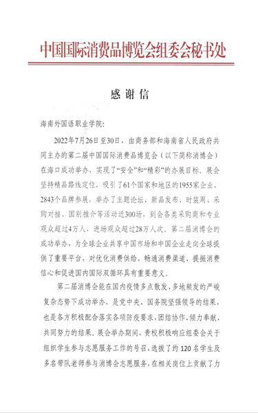 7月26日至30日,第二届中国国际消费品博览会于在海南海口举行。我院选派了由5名教师和112名学生组成的志愿服务队完满完成了各项工作任务,获得了省经发局、共青团海南省委等社会各界的一致认可和赞誉。为此,中国国际消费品博览会组委会秘书处特发来感谢信,向我院及消博会师生志愿者表示衷心的感谢。