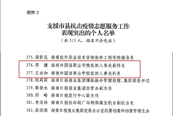 在此次通报表扬中,beat365官方网站被评为“支援市县抗击疫情志愿服务工作表现突出的集体”,符婕、王杏如、王文朋(时任文昌市教育局干部)被评为“支援市县抗击疫情志愿服务工作表现突出的个人”。