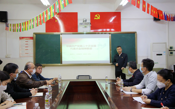 梁松分别从党的二十大总体情况、习近平总书记在党的二十大上作的报告、学习贯彻党的二十大精神等三个方面,带领大家再次深入学习了党的二十大精神,要求广大党员要把进一步学习宣传贯彻好党的二十大精神作为当前和今后一个时期的首要政治任务,深刻把握理解党的二十大提出的新思想、新观点、新论断,以忠诚担当、高度负责的精神状态做好本职工作,为培养新时代德能双馨会通中外的人才提供有效服务和有力保障。