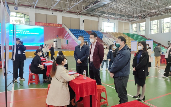 文昌市人力资源和社会保障局党组成员、就业服务中心主任雷珉,学校党委委员、副校长梁松在招聘会现场了解学生与用人单位双选情况