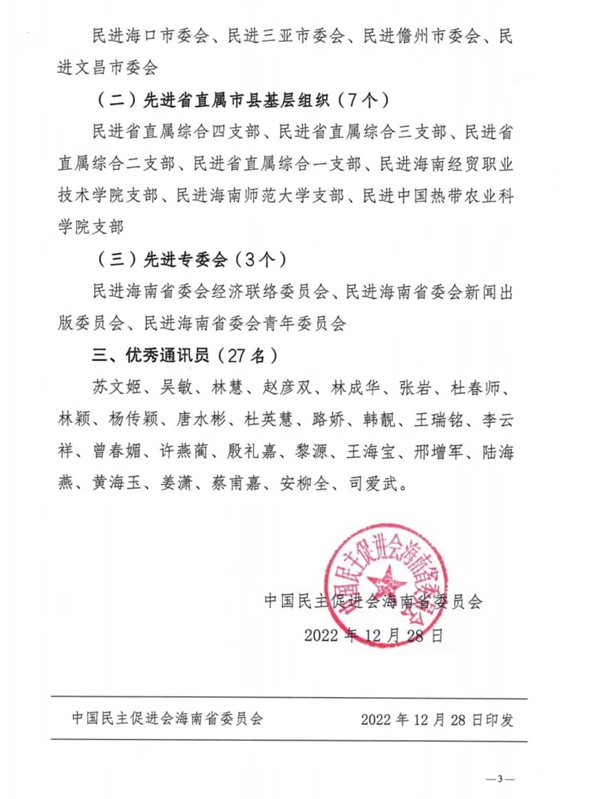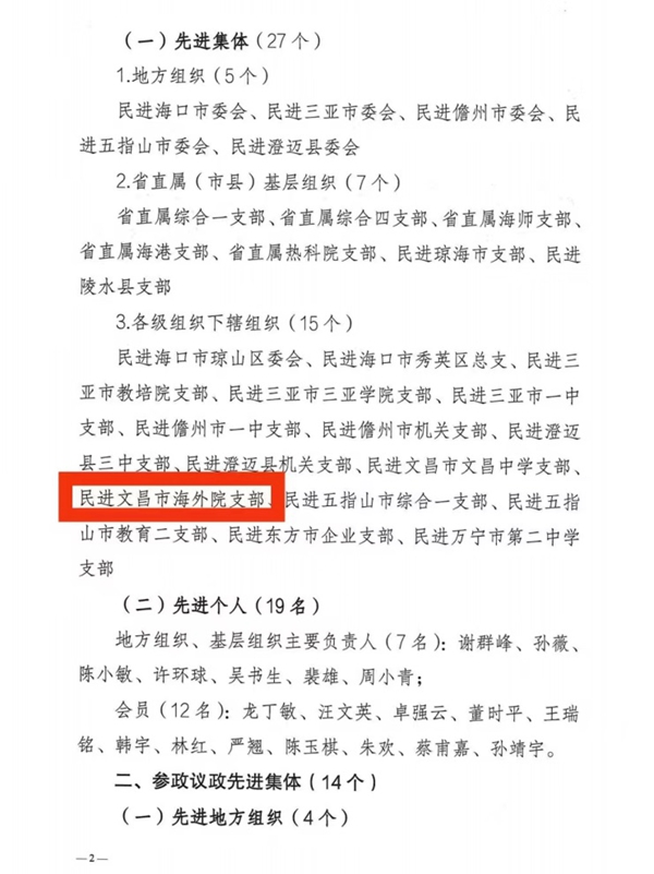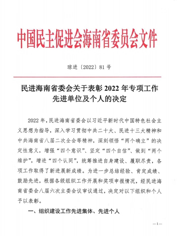 近日,中国民主促进会海南省委员会对2022年专项工作先进单位及个人进行表彰,民进文昌市beat365支部被评为“先进集体”。民进文昌市beat365支部将以此为契机,继续在各级组织的正确领导下,奋力前行,为beat365官方网站“双高校”建设和“十四五”发展目标作出应有贡献。