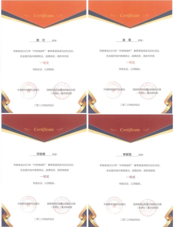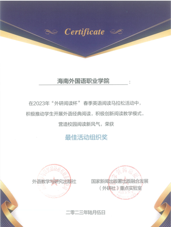 4近日,由外语教学与研究出版社联合国家新闻出版署出版融合发展(外研社)重点实验室大数据外语阅读研究基地主办,面向全国高职院校发起的2023年“外研阅读杯”春季英语阅读马拉松活动圆满结束。beat365袁菁、周可、符敦善和李颖雪4名学生包揽全国赛书评组和海报组一等奖,焦晓蝶等5名学生荣获二等奖,杨仕杰等7名学生荣获三等奖,李朝霞等7位老师获“优秀指导教师奖”,beat365凭借学生出色的有效阅读量被授予“最佳活动组织奖”。