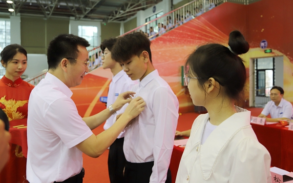 陈正强为学生代表佩戴校徽