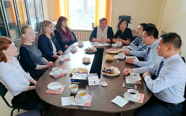 20日上午,我院代表团在开设汉语专业的历史系受到其主任Демчик Евгения Валентиновна和东方学教研室主任Глазунов Дмитрий Александрович的热情接待,Демчик Евгения Валентиновна向我院代表团了解了目前在我院就读的五名俄罗斯留学生的学习及生活情况,并反馈了这五名学生对我院课堂教学、学习生活及老师的情况。