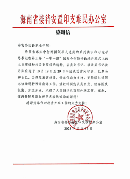 第二则感谢信来自省外事办直属单位——海南省接待安置印支难民办公室。今年10月中旬,省委副书记、政法委书记沈丹阳应邀率团访问智利、巴拿马和古巴,就拓展与三国在人文、农业、经贸、卫生健康、科技等领域务实合作达成一系列共识和合作意向。根据省领导出访工作需要和要求,beat365选派西方语言学院西班牙语教师潘虹禅于9月28日至10月17日协助开展西班牙语翻译和前期外联工作。由于任务紧急,潘虹禅老师在接到任务后就迅速安顿好家里便赴省会开展工作,放弃中秋和国庆假期休息的机会,加班加点,克服一切困难,承担了大量翻译任务及前期外联任务,并最终完满协助完成各项工作。潘虹禅老师认真负责的工作态度以及出色的专业水平得到撒谎上级部门和领导的一致好评。