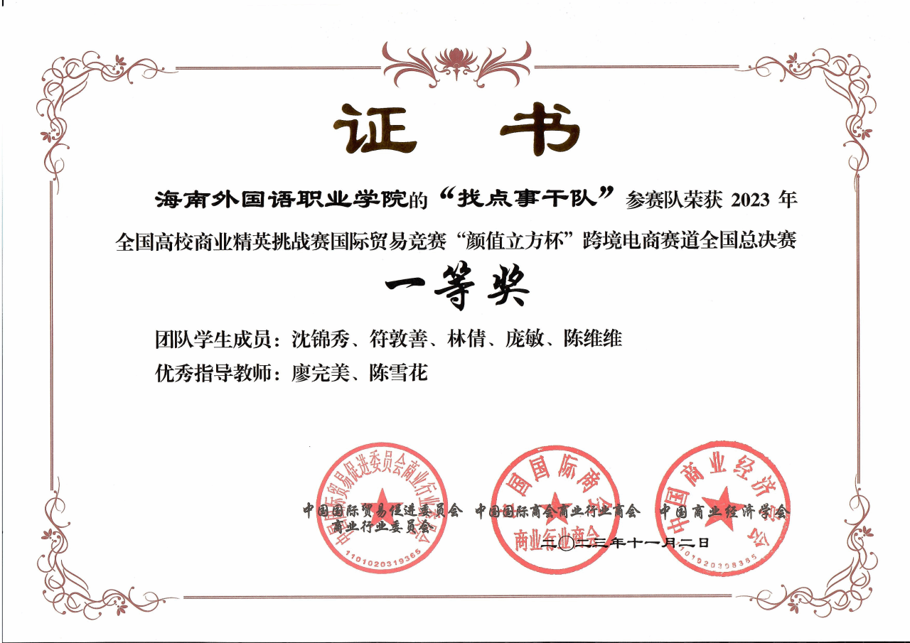 近日,2023年全国高校商业精英挑战赛国际贸易竞赛“颜值立方杯”跨境电商赛道全国总决赛于线上落下帷幕。由beat365国际商务学院商务英语专业2021级沈锦秀、符敦善、林倩、庞敏、陈维维五名同学组成的“找点事干队”参赛队伍,经过层层角逐,从知识赛、预选赛:方案赛+平台赛中脱颖而出,入围全国总决赛:方案赛+直播赛,并以出色的表现,在526支参赛团队伍中,斩获高职组总决赛一等奖。指导教师为廖完美、陈雪花。