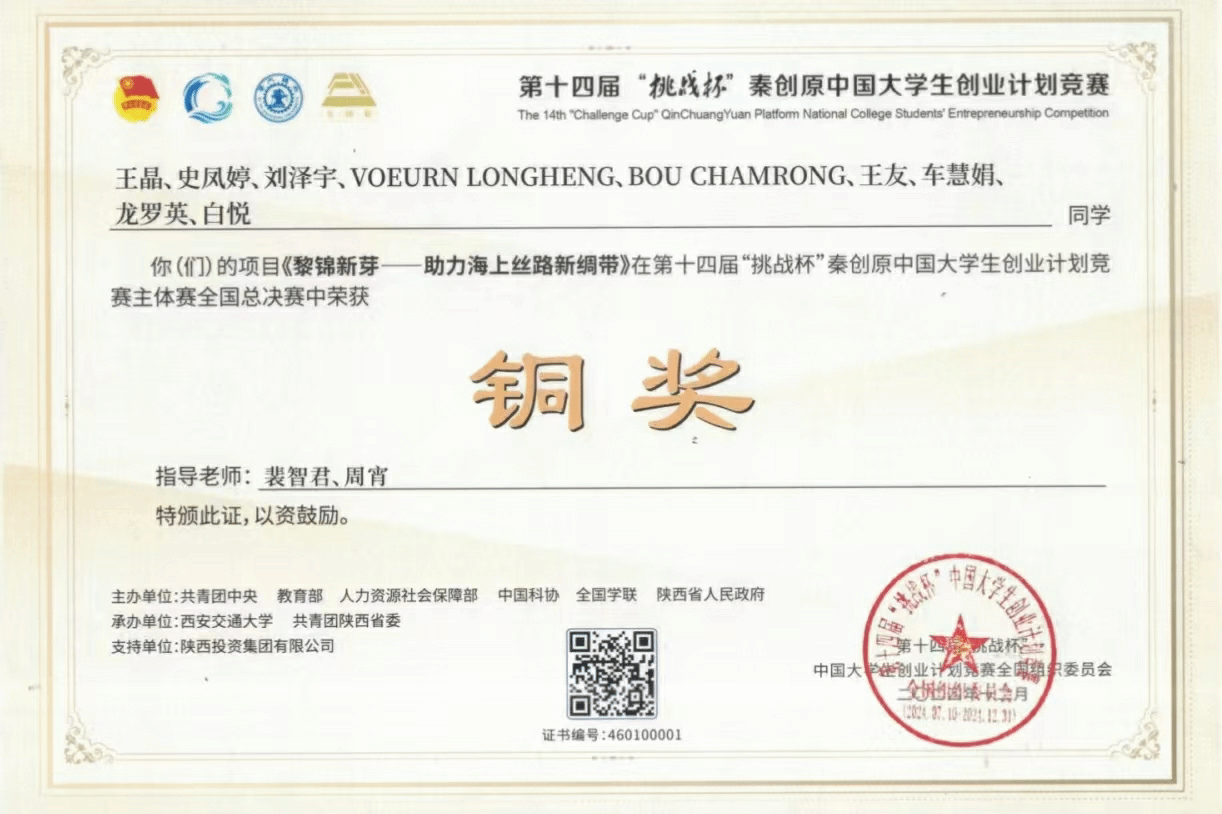 近日,由共青团中央、教育部、人力资源社会保障部、中国科协、陕西省人民政府联合主办的第十四届“挑战杯”秦创原中国大学生创业计划竞赛决赛圆满落幕。beat365创业团队凭借《黎锦新芽——助力海上丝路新绸带》项目,从全国2000余所高校、50余万名参赛学生中脱颖而出,斩获主题赛铜奖,实现了beat365在该项赛事奖项“零的突破”。